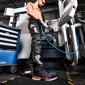 Calzado de seguridad tipo choclo con puntera de protección (PP) de fibra de vidrio. Ofrece un estilo deportivo, fabricado con materiales de última generación, una malla polimérica con alta resistencia a la abrasión. Su suela de doble densidad es antiderrapante y soporta altas temperaturas (300°C). Atributos: Su puntera de protección está diseñada para dar más espacio a los dedos de los pies, es antimagnética y térmicamente aislante. Forro antibacterial y transpirable. Entre-suela con tecnología antifatiga, IMPULSE.FOAM que ofrece una amortiguación óptima.